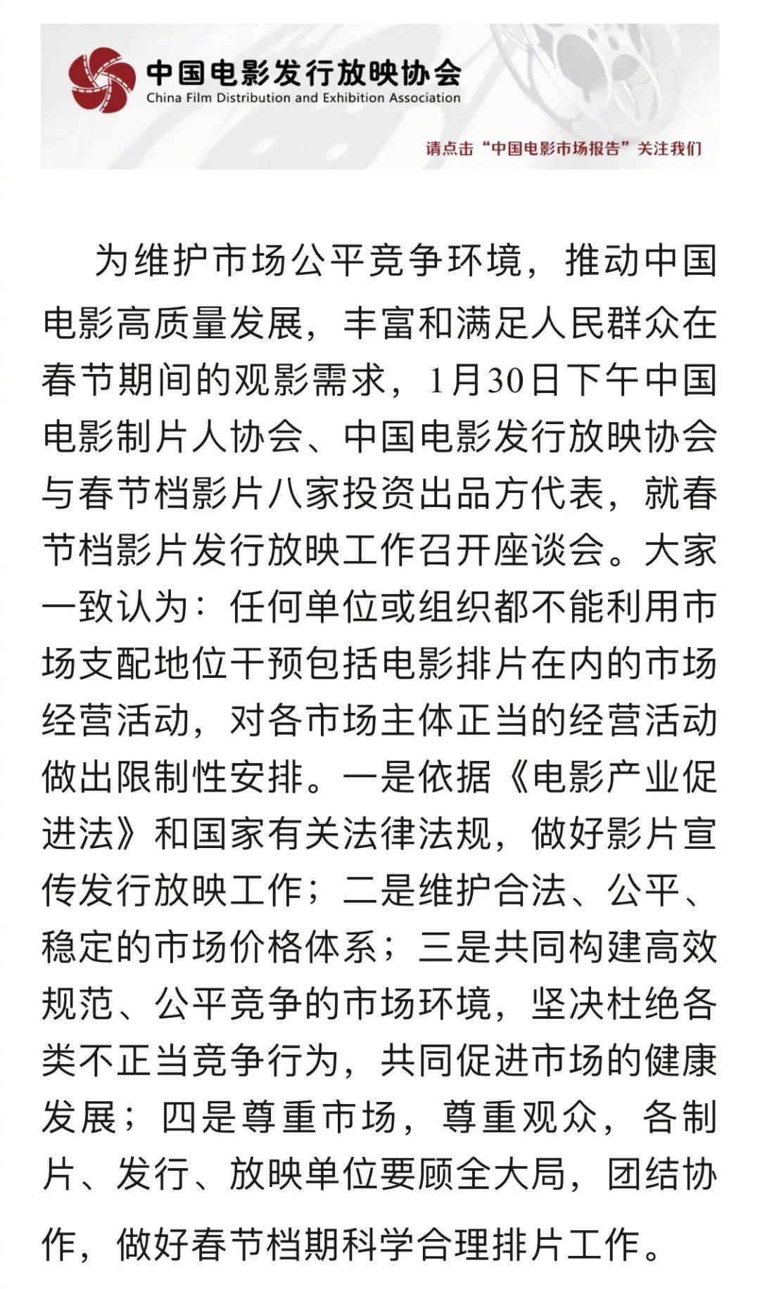 为维护市场公平竞争环境,推动中国电影高质量发展,丰富和满足人民群众在春节期间的观影需求,1月30日,中国电影制片人协会、中国电影发行放映协会与春节档影片八家投资出品方代表,就春节档影片发行放映工作召开座谈会。大家一致认为:任何单位或组织都不能利用市场支配地位干预包括电影排片在内的市场经营活动,对各市场主体正当的经营活动做出限制性安排。