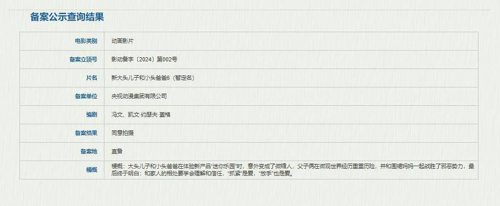 1905电影网讯 据国家电影局关于2023年12月下全国电影剧本(梗概)备案、立项公示的通知,《新大头儿子和小头爸爸6》(暂定名)正式立项。
