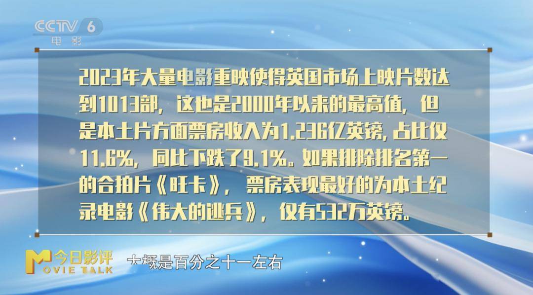 拆分来看,2023年度英国电影市场有一个很大的特色,就是它上映影片的数量达到了1013部,是2000年以来最高的一次,但是其中大部分都是重制的影片,英国本土的电影更是只占到了总体票房的百分之十一左右,所以其实票房收入是不太理想的。