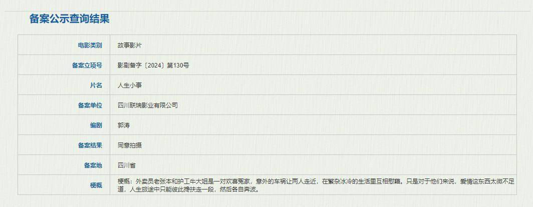 原标题:《人生大事》后又一新作!电影《人生小事》立项