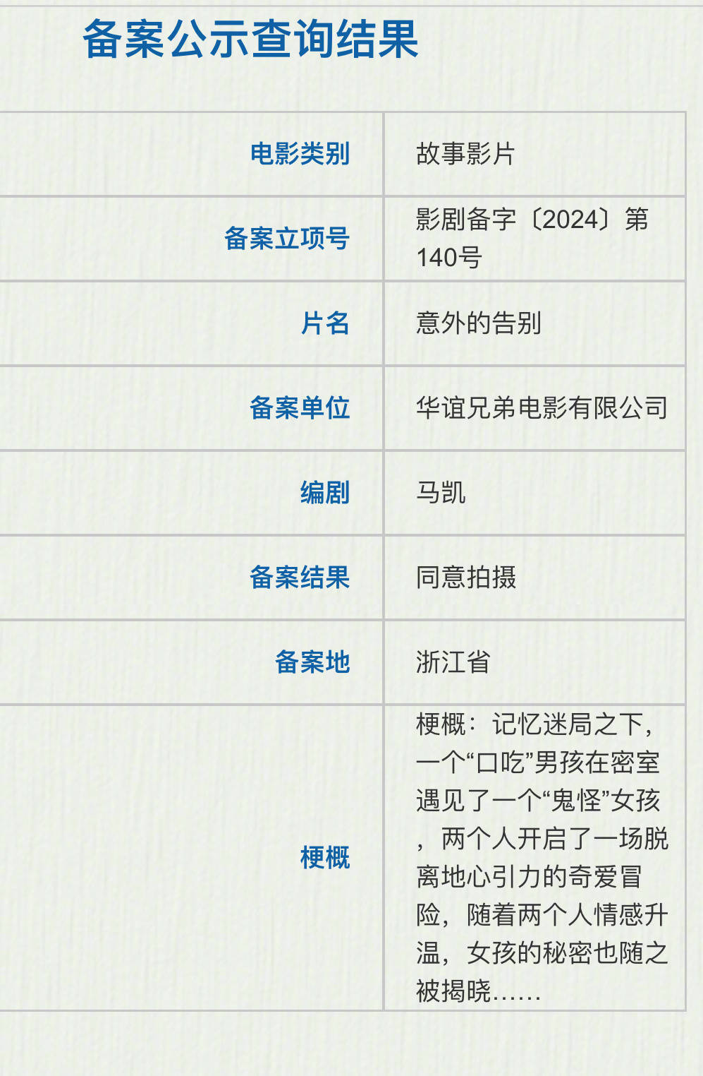搜狐娱乐讯 据国家电影局2023年12月下全国电影剧本(梗概)备案、立项公示,《中邪》导演马凯新片《意外的告别》立项。《意外的告别》备案单位为华谊兄弟电影有限公司,编剧马凯(《中邪》《了不起的夜晚》)。