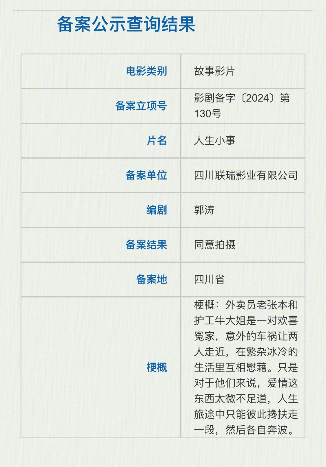 搜狐娱乐讯 据国家电影局2023年12月下全国电影剧本(梗概)备案、立项公示,《人生大事》片方出品新片《人生小事》立项。备案单位为四川联瑞影业有限公司,编剧郭涛。