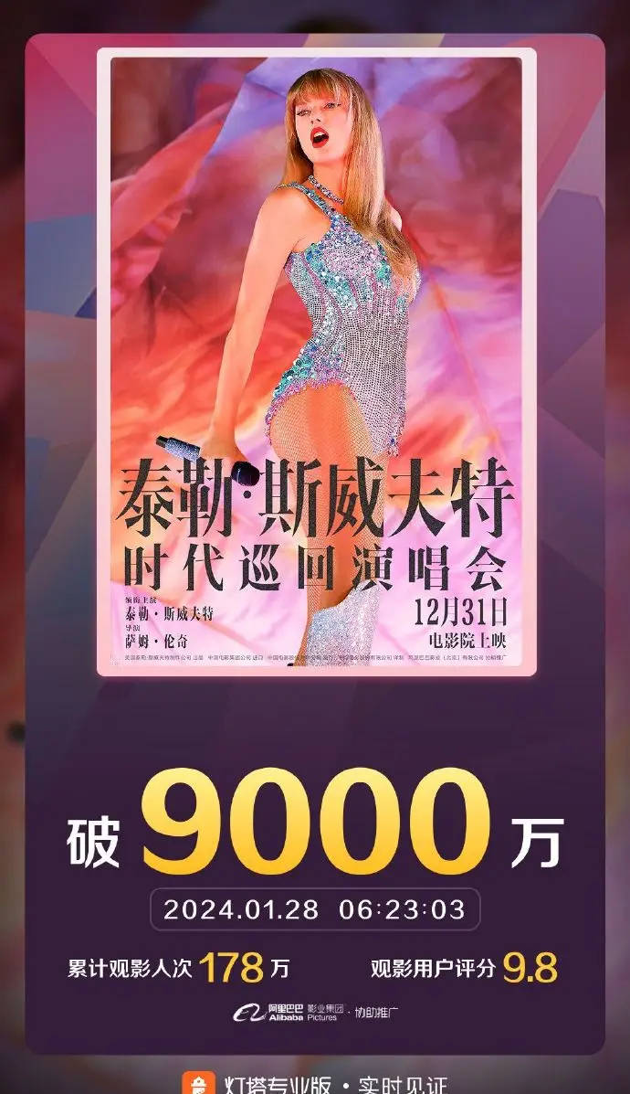 搜狐娱乐讯 据灯塔专业版,截至1月27日06时23分,影片《泰勒·斯威夫特:时代巡回演唱会》票房突破9000万!