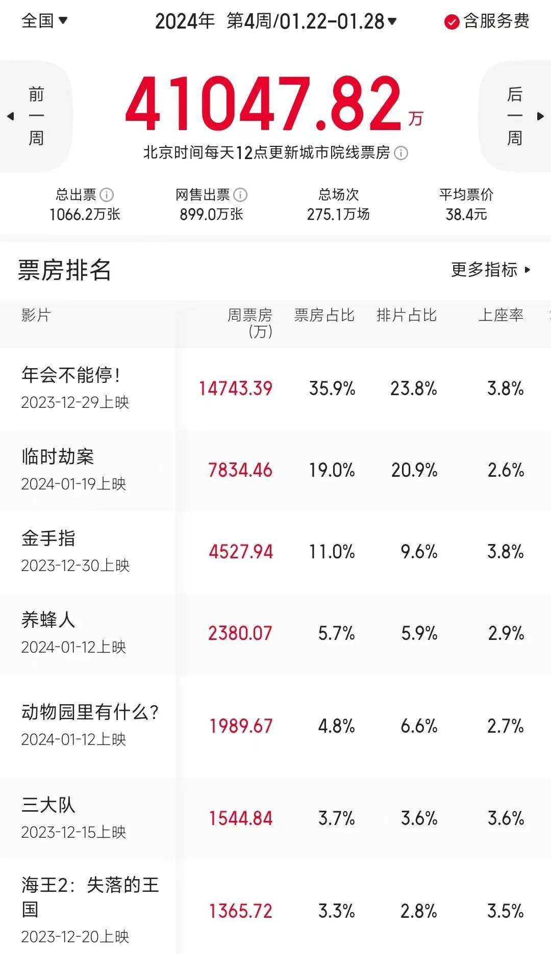 元旦档的主力老片们仍有两部在周榜前七。《年会不能停!》报收1.47亿连续四周蝉联周冠军,累计已达11亿;《金手指》报收4527万列周榜第三,累计5.04亿;比元旦档这批更早上映的《三大队》和《海王2》现在还有市场,一周分别报收1544万和1365万,分列周榜六七,累计分别为6.86亿和4.39亿。