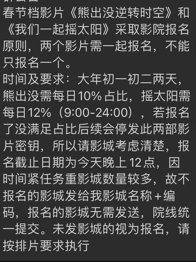 《熊出没》则是要求12%,《我们一起摇太阳》要求10%,且影院必须同时保持这两部影片的排片率。这两部电影背后的发行方均有联瑞影业。