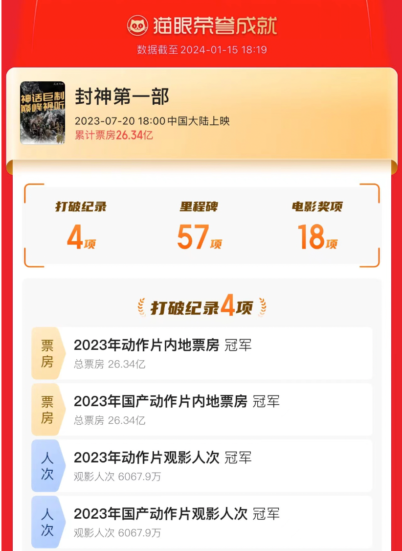 虽说《封神第一部:朝歌风云》的成功不完全是靠放大青年演员的青春属性,但是不得不承认它是将“青春元素”运用得最好的。据猫眼专业版数据,电影《封神第一部:朝歌风云》1月19日结束公映,累计总票房26.34亿,总观影人次6068万,上映至今共打破4项纪录,获得57项里程碑成就,18个奖项及提名,获得2023年动作片票房、人次冠军。