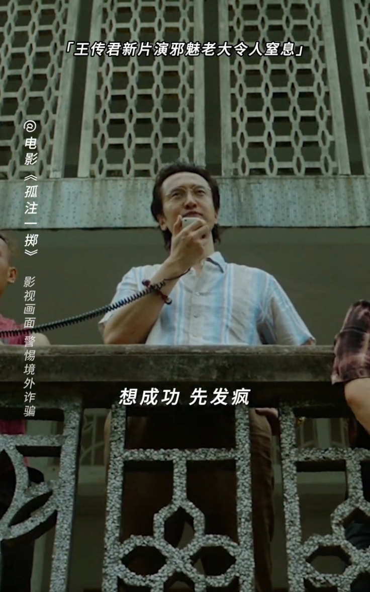 最为典型的就是《孤注一掷》。《孤注一掷》上映官宣之际,缅北电诈话题才被简单报道,但《孤注一掷》宣传方极为敏锐地捕捉到了这一社会话题,在前期宣传期间发布片中电诈头目教训手下触目惊心的现场,被包装为“境外诈骗工厂”,截取的是演员王传君代表诈骗集团魔性洗脑口号物料,依靠王传君精湛真实的表演和猎奇的诈骗集团写实,在发布后立刻引起了网友的巨大反响,尤其还因为太过逼真被短视频平台屏蔽。后期针对这一热点再次包装多款相似短视频,引发大量想一睹电诈现场的观众的围观,《孤注一掷》也抓住机会,打出“多一个人看片,少一个人受骗”,直击社会话题核心。