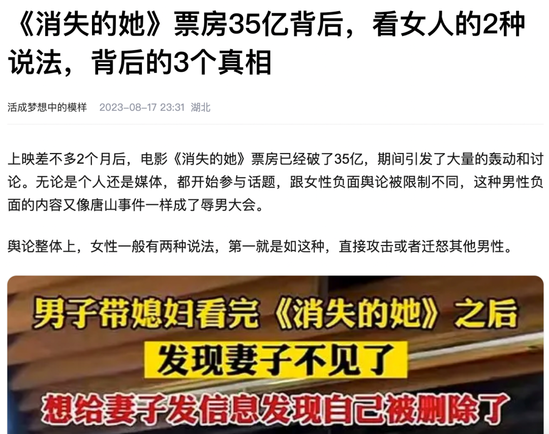 《消失的她》从片名开始,就暗示其是一部妥妥的女性话题电影,其在营销的过程中,悬疑和女性两手抓,但显然“女性”才是其成为全民关注的缘由。前期,影片宣传释放出“凤凰男”“杀妻”“girls help girls”等标签化的碎片,激起女性观众的兴趣;后期,在朱一龙饰演的渣男被全网唾弃之时,合理化利用女性愤怒情绪,不仅在影院门口放朱一龙人形立牌供观众“泄愤”,还营销其“更适合中国宝宝体质的反婚反赌宣传片”“几十块钱完成摘除恋爱脑手术”精准地击中了当代女性的婚恋焦虑。