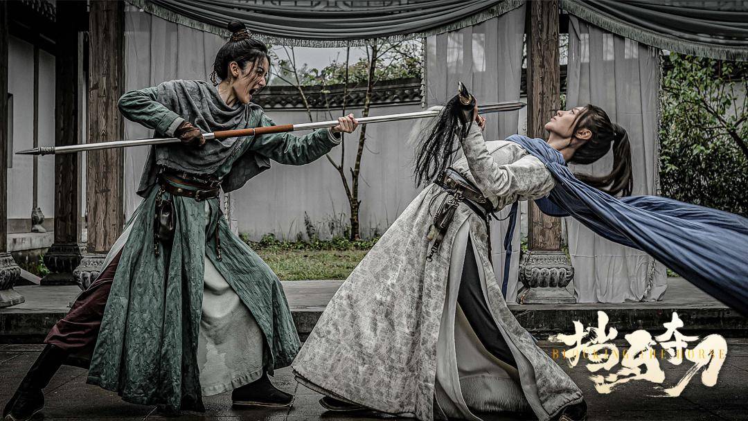 影片高潮武打戏中,身负重伤的姐妹二人一起守在门口,用大刀堵住辽兵,上演了“挡马”“夺刀”的英勇场面。