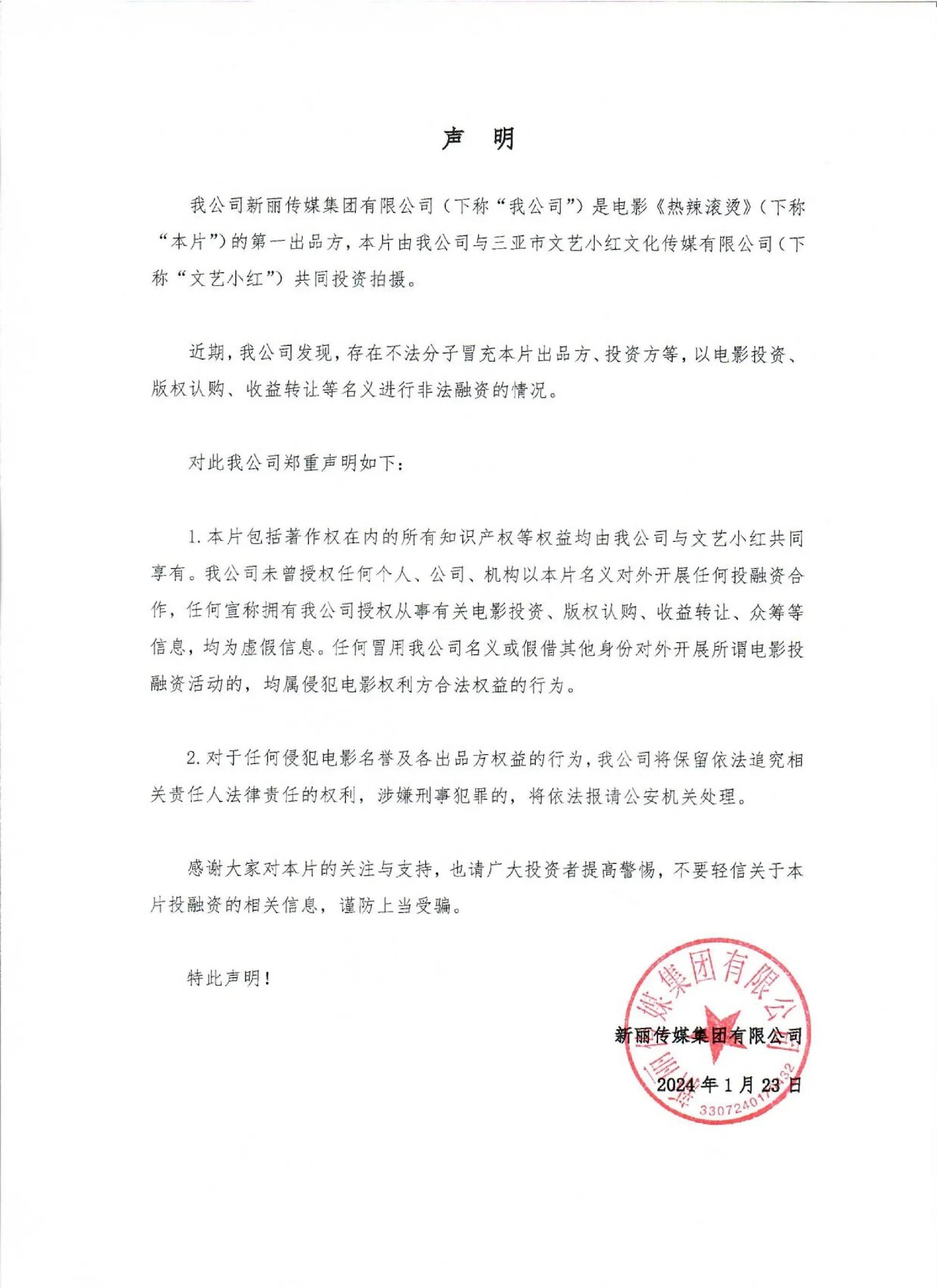 搜狐娱乐讯 近日,贾玲新片《热辣滚烫》出品方发布声明称,近期存在不法分子冒充本片出品方、投资方等,以电影投资、版权认购、收益转让等名义进行非法融资的情况。该公司未授权任何个人、公司、机构以该片名义对外开展任何投融资合作,特提醒投资者提高警惕,谨防上当受骗。有ID为“A电影版权份额认购”的人曾称自己拥有《热辣滚烫》《红海行动2》《飞驰人生2》等多部影片的投资份额,还拿出了所谓的“电影投资流程图”和《收益权转让协议》,经媒体向《热辣滚烫》片方核实,“肯定是假的”。一部电影,从筹备到上映都有一套完整的商业运作模式,正规的电影投资,它针对的都是各大影视公司,几乎不会面向个人。