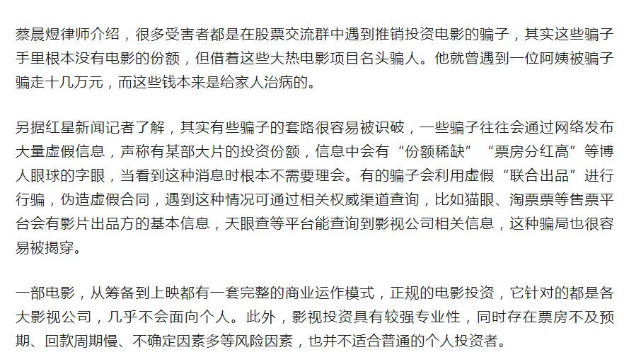 此外,影视投资具有较强专业性,同时存在票房不及预期、回款周期慢、不确定因素多等风险因素,也并不适合普通的个人投资者。