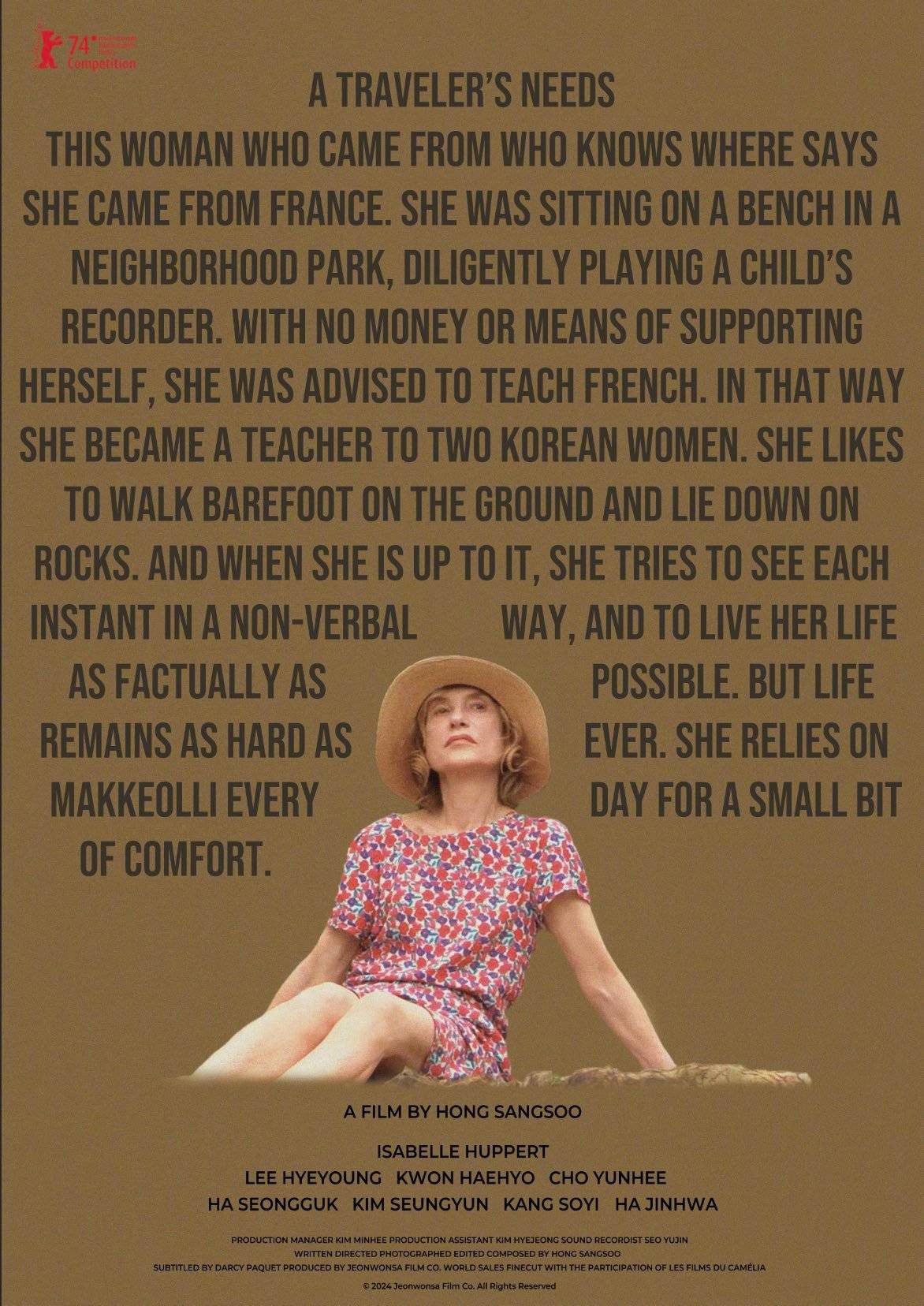 搜狐娱乐讯 洪尚秀执导,伊莎贝尔·于佩尔主演电影《旅行者的需求》发布首张海报,直接将剧情简介写在了海报上,创意十足~影片讲述一个法国人教两位韩国女人法语后发生的故事。