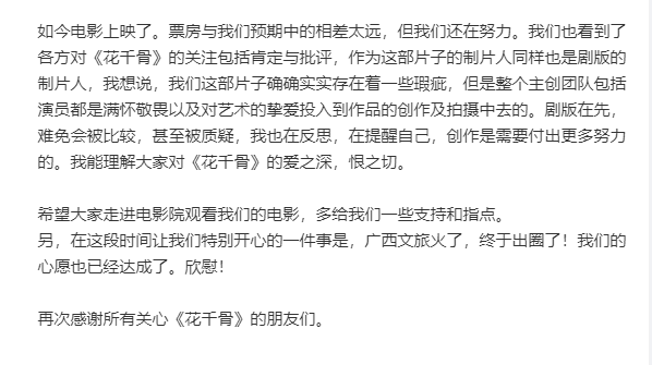 原标题:电影《花千骨》制片人发长文回应争议:票房存在落差但仍在努力