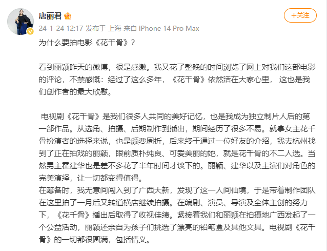 搜狐娱乐讯 1月24日,电影《花千骨》制片人唐丽君发文回应争议,说道:“如今电影上映了。票房与我们预期中的相差太远,但我们还在努力。我们也看到了各方对《花千骨》的关注包括肯定与批评,作为这部片子的制片人同样也是剧版的制片人,我想说,我们这部片子确确实实存在着一些瑕疵,但是整个主创团队包括演员都是满怀敬畏以及对艺术的挚爱投入到作品的创作及拍摄中去的。”
