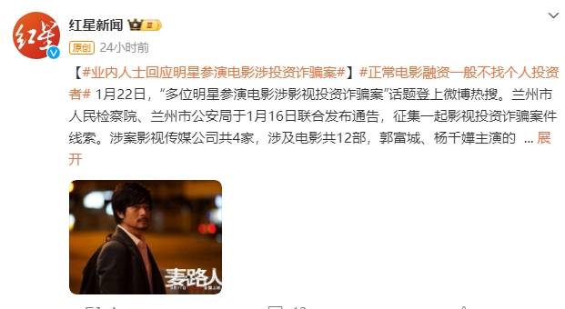 1月22日,“多位明星参演电影涉影视投资诈骗案”话题登上微博热搜。兰州市人民检察院、兰州市公安局于1月16日联合发布通告,征集一起影视投资诈骗案件线索。涉案影视传媒公司共4家,涉及电影共12部,郭富城、杨千嬅主演的电影《麦路人》和舒淇主演的电影《痞子爱人》位列其中。北京大学文化产业研究院副院长陈少峰表示,此前他有关注到《水门桥》《流浪地球2》对外发布的遭遇虚假融资的声明,陈少峰提醒,目前市场上一些大片投资巨大,一般属于影视机构投资。个人投资的风险大,很难控制,如果投资人投资前没有得到很好的预警提示,可能陷入电影投资的骗局。
