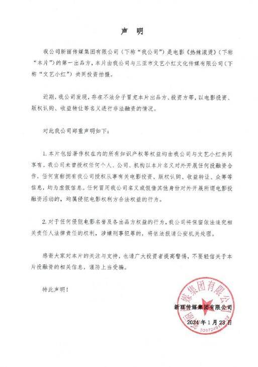 搜狐娱乐讯 1月23日,由贾玲执导,贾玲、雷佳音领衔主演的电影《热辣滚烫》发布声明维权,对于近期存在不法分子冒充《热辣滚烫》出品方、投资方等,以电影投资版权认购、收益转让等名义进行非法融资的情况。