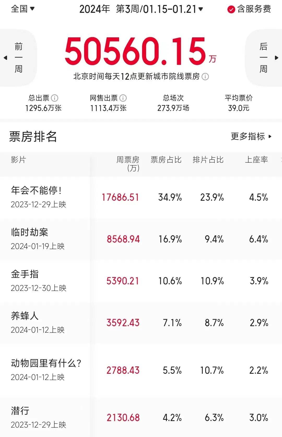 更早一周上映的老片当中,杰森·斯坦森主演的动作片《养蜂人》和包贝尔、贾冰主演的喜剧《动物园里有什么?》第二周分别报收3592万和2788万,列周榜四、五位,累计票房6777万和6445万。两片预计最终总票房都在8000万到1.2亿之间。