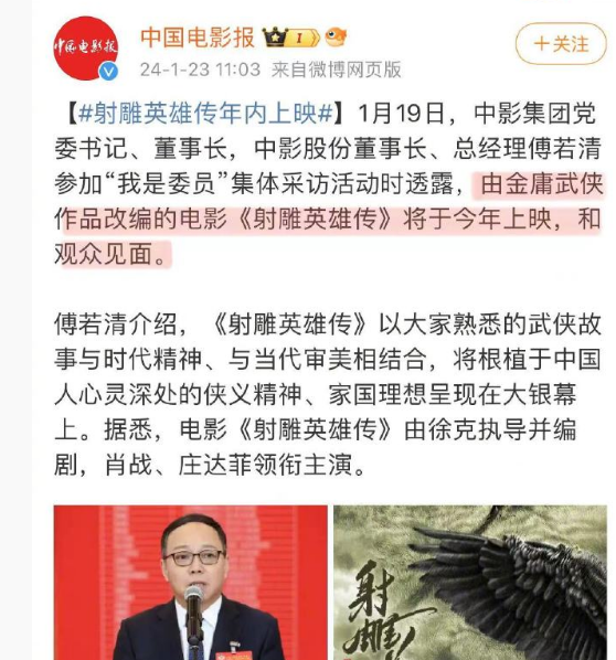 搜狐娱乐讯 据中国电影报报道,近日,中影集团董事长傅若清参加采访活动透露,由徐克执导,肖战、庄达菲领衔主演的金庸武侠作品改编的电影《射雕英雄传:侠之大者》目前正在创作中,将于今年上映与观众见面!
