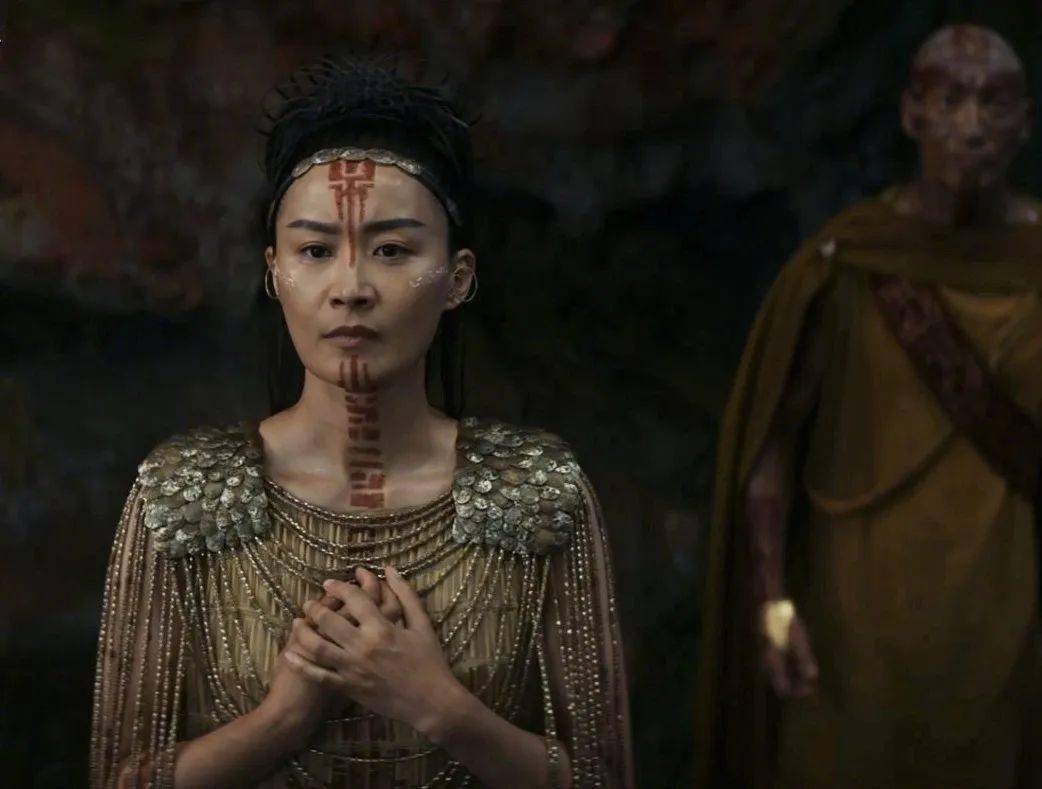 这个妆容跟之前预告中那个背影一致,跟我之前推测的一样,陈法拉在这里饰演的应该就是地心的人类当中的祭司一样的存在,总之应该是个精神领袖,之前KDM的爆料中提到这个角色会发挥重要作用,如果结合魔斯拉的登场的话,说不定就是她把魔斯拉给唤醒的,在日版电影当中,魔斯拉的苏醒总是会跟这些土著居民有关。