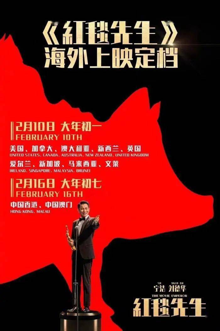 由宁浩执导,刘德华主演的新片《红毯先生》海外定档。影片将于2024年2月10日大年初一在美国、加拿大、澳大利亚、新西兰、英国、爱尔兰、新加坡、马来西亚、文莱上映,将于2月16日大年初七在中国香港、中国澳门上映。