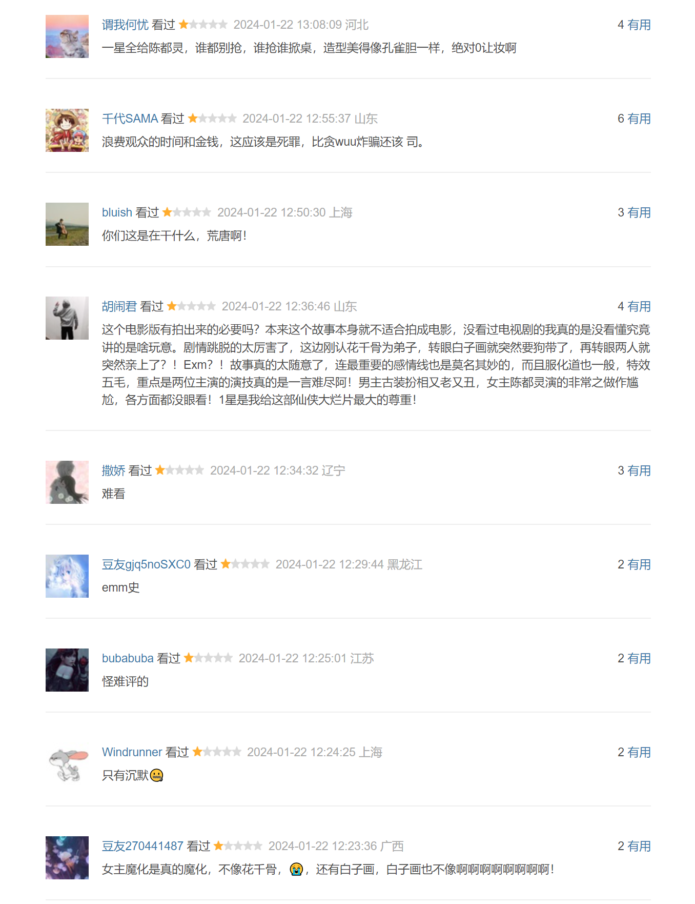 品质实在太差,不但很难吸引普通观众入场,就连小说粉和剧粉也望而却步。目前豆瓣有近2000条短评,基本是一边倒的差评,有观众吐槽“像七八年前热钱涌入影市拍的那种烂片,现在已经基本没有了,内心竟有意思‘感动’。”还有笔者熟悉的ID,是一位颇有影响力的影评人,他的点评是“和《诛仙》《三生三世十里桃花》电影版难分伯仲。”尽管女主演技不尽人意,没少招致批评,可是还有打三星的观众拉踩赵丽颖,认为女主(陈都灵)的演技感觉比赵丽颖好一些。
