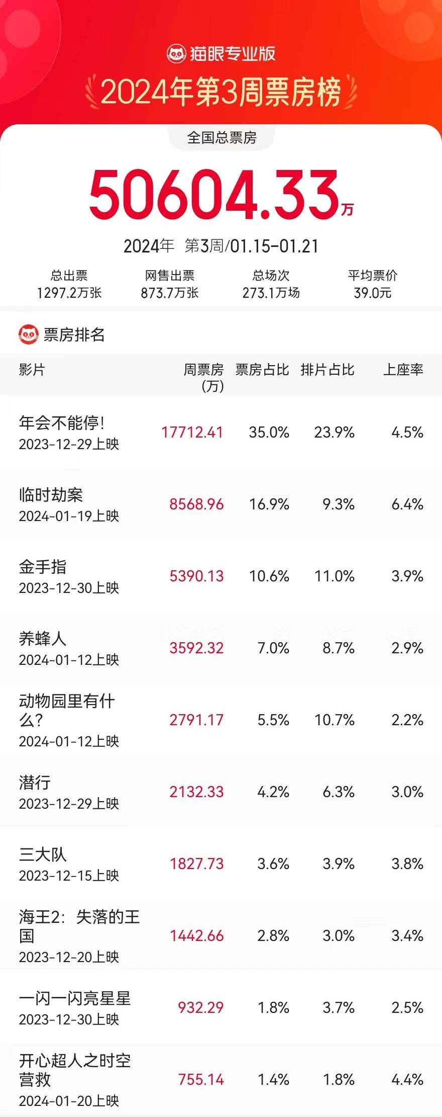 原标题:1.15-1.21内地一周票房5.06亿 《年会不能停》1.77亿三连冠上映24天累计9.51亿