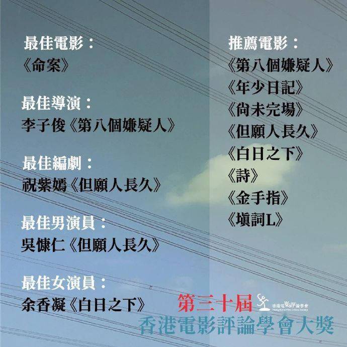 1905电影网讯 日前,第30届香港电影评论学会大奖五个奖项及八部推荐电影公布,导演获最佳电影,获最佳导演,祝紫嫣《但愿人长久》夺最佳编剧,、分获最佳男、女演员。八部推荐电影为《第八个嫌疑人》《尚未完场》《但愿人长久》《诗》《填词L》。
