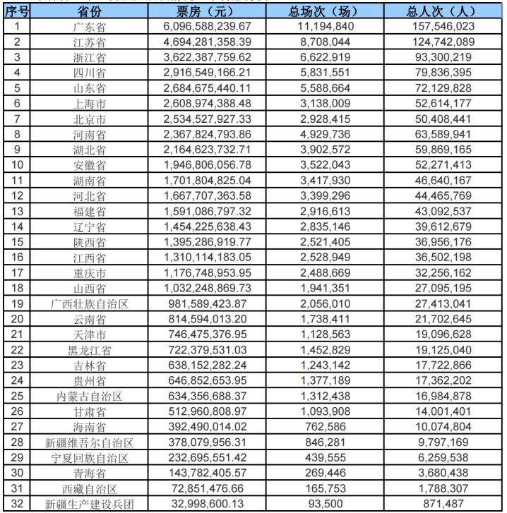 此外,河南省、湖北省、安徽省年度票房保持在20亿元以上。除新疆、宁夏、青海、西藏等少数西部省、自治区外,其余省市年观影人次均在1000万人以上。