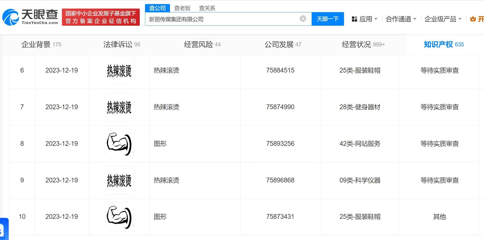 搜狐娱乐讯 天眼查App显示,近日,新丽传媒集团有限公司申请注册多枚“热辣滚烫”商标,国际分类包括网站服务、教育娱乐、健身器材等,当前商标状态均为等待实质审查。