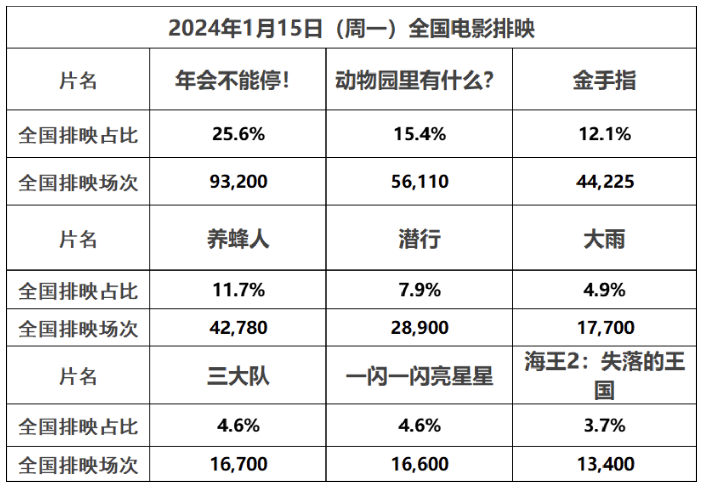 周一工作日市场排映情况:《年会不能停》单日占比回升至25.6%,继续扩大了对亚军的领先优势。《动物园里有什么?》单日占比下跌至15.4%,仍位列排片亚军。《金手指》占比回升至12.1%,反超新片《养蜂人》回升至排片季军,后者占比降至11.7%。《潜行》占比也回升至7.9%重返前五,《大雨》占比跌破5%。