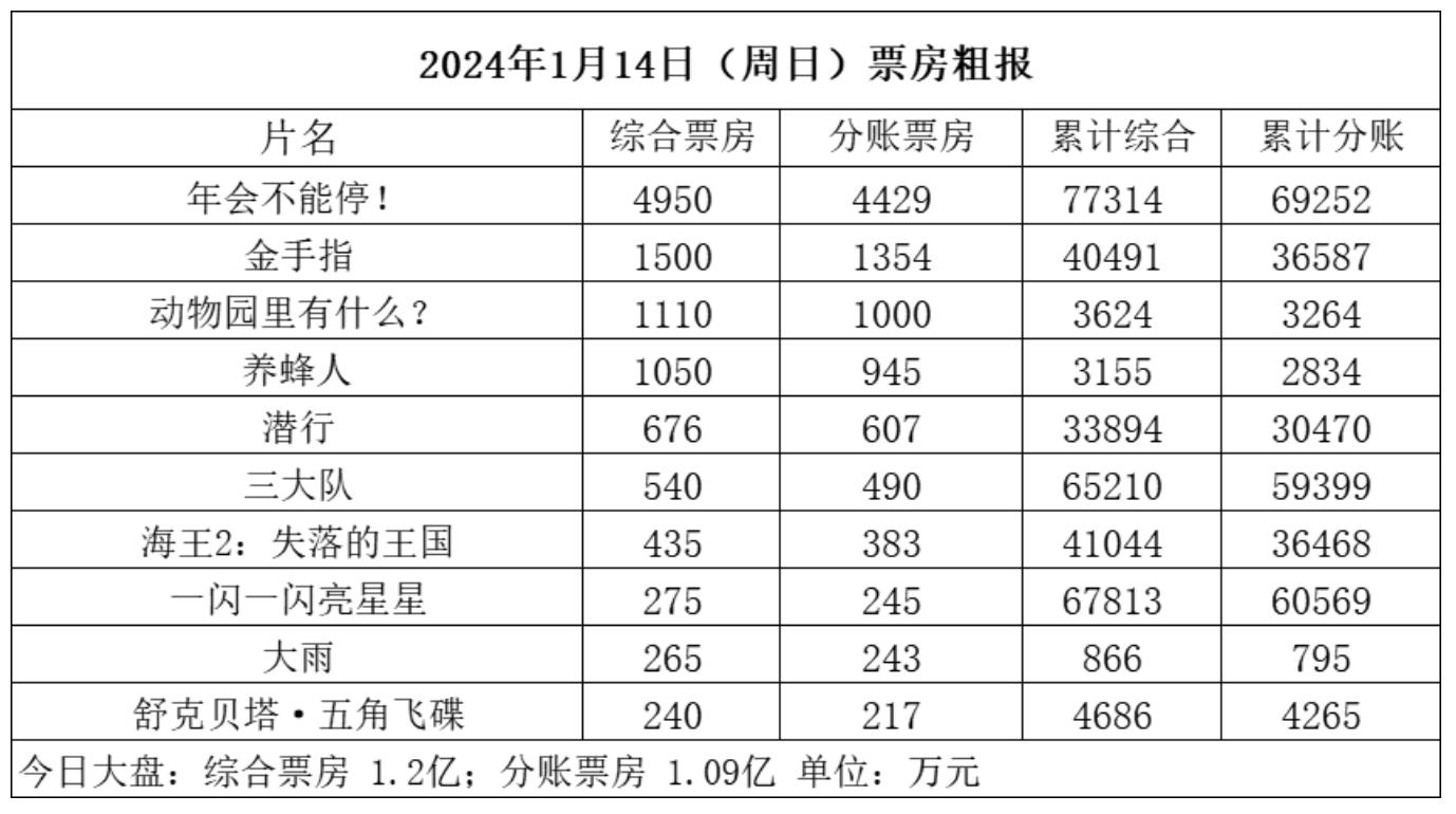 1月14日(周日),全国共排映42.2万场,观影人次约301万,根据初步统计产出票房1.2亿。