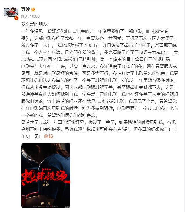 贾玲之所以地狱式减肥是为了她导演、主演的新片《热辣滚烫》——随着影片官宣定档大年初一,贾玲在社交平台上发文确认,自己成功减了100斤,并且练成了片中拳击手的样子。电影为此整整拍了一年,前后开机五次。