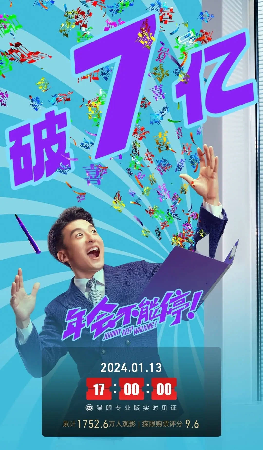 搜狐娱乐讯 据猫眼专业版数据,截至1月13日17时,电影《年会不能停!》上映第16天,总票房破7亿,累计1752.6万人观影。