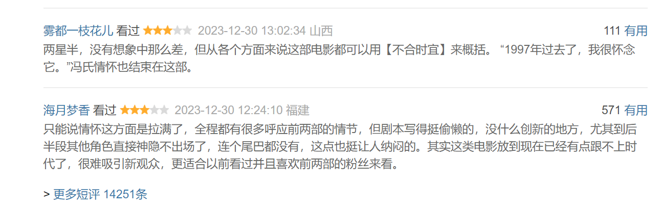 还有观众打两星半,并给出理中客的评价“没有想象中那么差,但从各个方面来说这部电影都可以用【不合时宜】来概括。‘1997年过去了,我很怀念它。’冯氏情怀也结束在这部。”