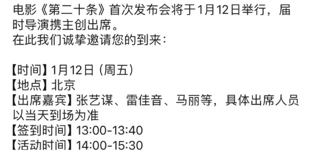 之所以用“果不其然”,是因为片方在1月10日开始做1月12日的发布会邀请,这是电影举办的首次发布会,没有看片环节。而这也是张艺谋第三次闯进春节档,前两部分别为《狙击手》和《满江红》,狙击手票房6.08亿,《满江红》则以45.44亿的出色成绩位列内地影史第六。