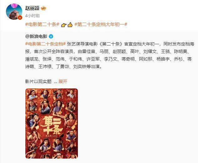 赵丽颖在社交平台上发布手语文案,意为“你好”,为自己的新片宣传。