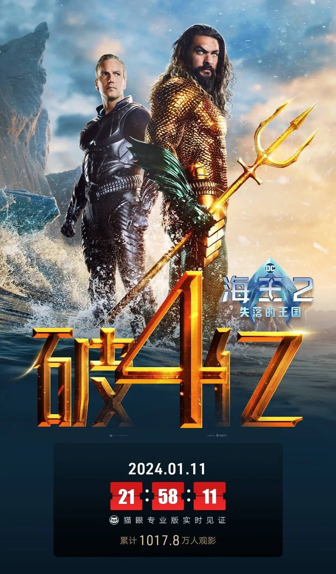 搜狐娱乐讯 据猫眼专业版数据,截至1月11日21时58分,电影 《海王2:失落的王国》 上映23天 ,总票房破4亿,累计1017.8万人观影。