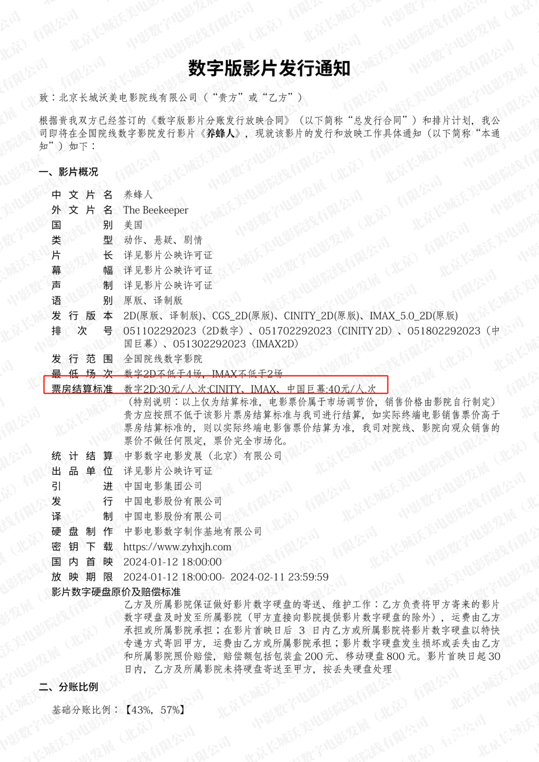 南都记者联系到了行业观察大V连城易脆,他也观察到这个现象:“《养蜂人》普通数字2D版本的最低发行价罕见地提到了30元,打破了过往进口片普通数字2D版本最低发行价20元的传统。而电影院具体定价是市场行为,不低于发行通知最低发行价即可,一般发行通知写的是结算价格。有时候我们买到低于发行价的票是因为有票补,实际结算价肯定高于最低发行价。而且这次《养蜂人》密钥生效期也学国产片放在了晚上6点,之前的进口片也较少出现这种情况,这部进口片的发行变得国产片化。”