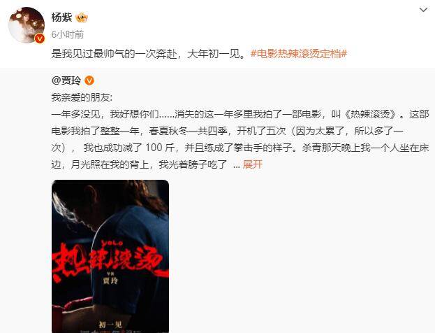 原标题:杨紫为贾玲新片《热辣滚烫》打call:是我见过最帅气的一次奔赴
