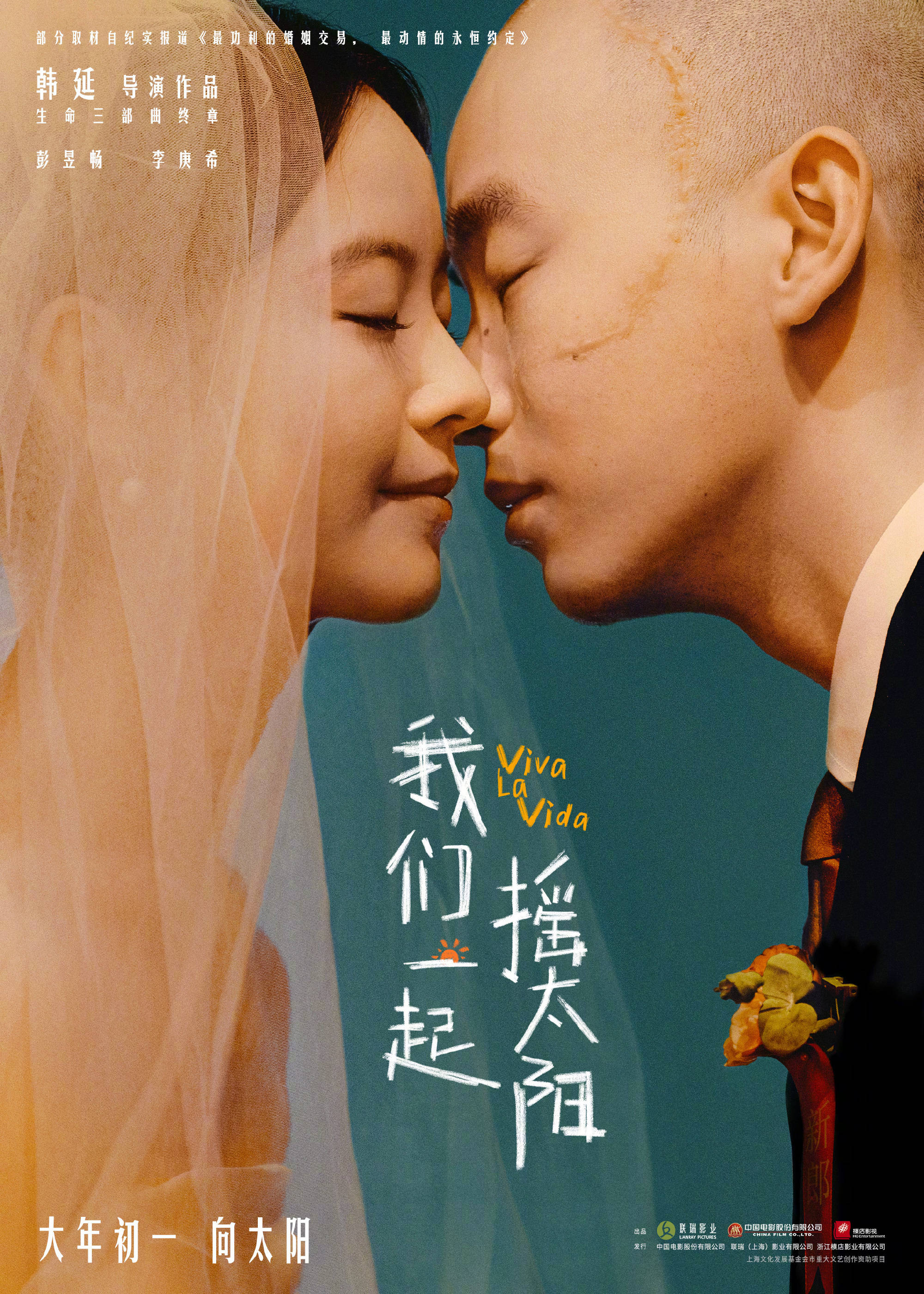电影《我们一起摇太阳》此次发布的定档海报中,身穿结婚礼服的吕途和凌敏相互贴近,定格在幸福的瞬间,而吕途头上醒目的伤疤则暗示着两人的病患身份。两人此次曝光的造型和此前影院版预告中憔悴的状态大不相同,他们的关系也从针锋相对变为相伴相依,让人不禁好奇在这之间发生了怎样曲折动人的故事。这也是彭昱畅和李庚希的首度合作。
