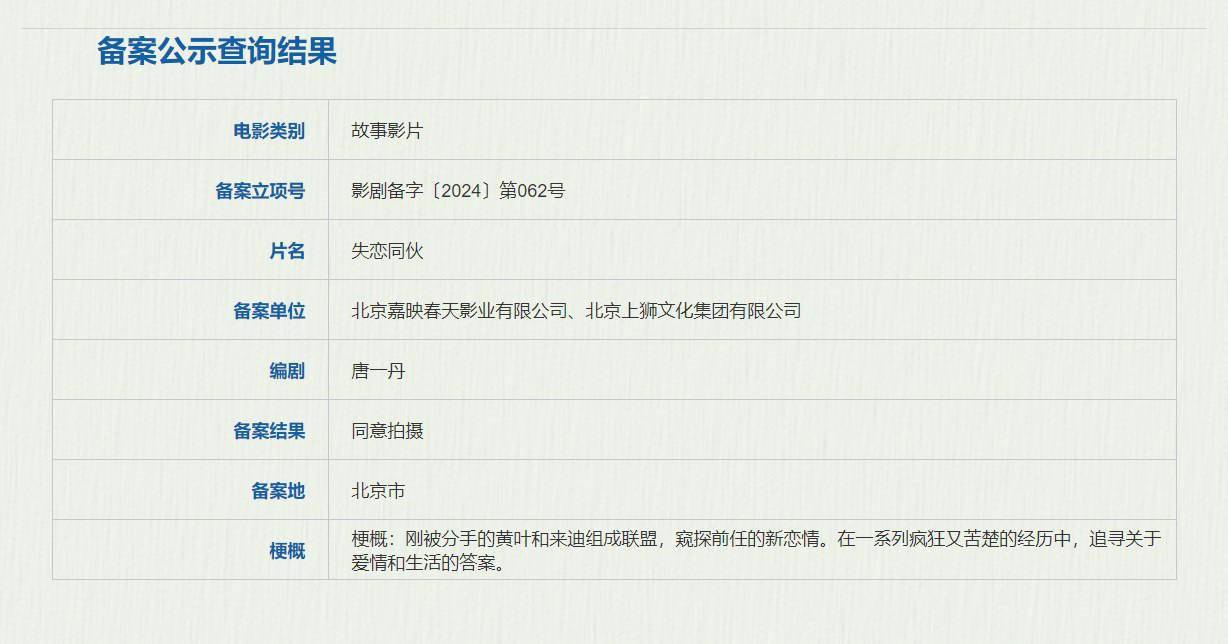 1905电影网讯据国家电影局2023年12月上全国电影剧本(梗概)备案、立项公示的通知,《失恋同伙》正式立项备案。故事梗概为:刚被分手的黄叶和来迪组成联盟,窥探前任的新恋情。在一系列疯狂又苦楚的经历中,追寻关于爱情和生活的答案。