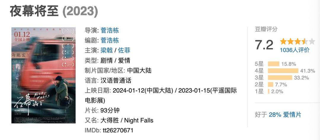 《夜幕将至》其实也是一部值得关注的小成本艺术片,影片去年曾亮相平遥国际影展,还拿到了费穆荣誉最佳影片,之后也在其他一些电影节展上亮相,也拿到了一些提名或者奖项。