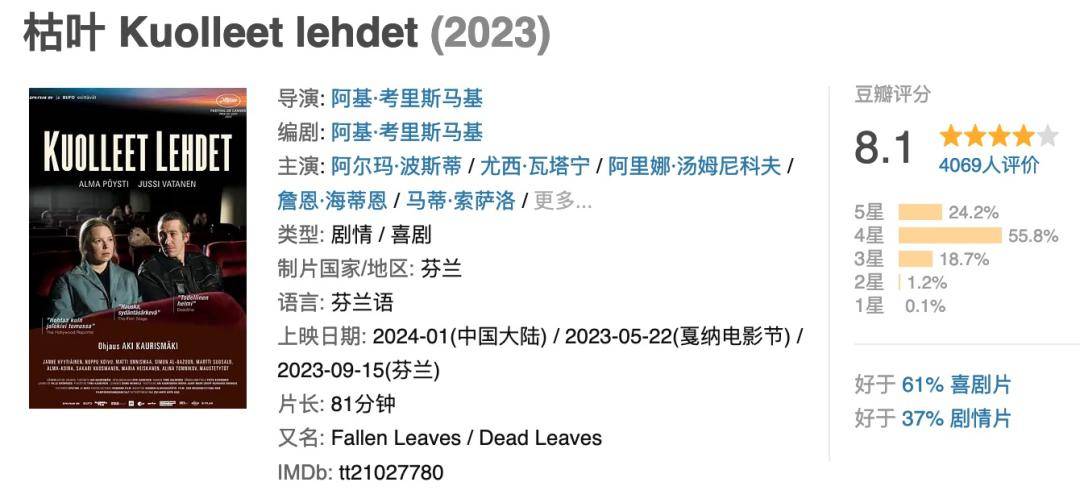 大家等了很久的阿基·考里斯马基的新片《枯叶》也终于有得看了。这部电影的特点就是,仍然保持着阿基一贯的风格,包括阿基最爱的主题。