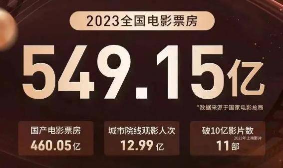 根据国家电影局数据,2023年度全国电影总票房549.15亿元,城市院线共服务观众12.99亿人次。国产影片年度票房460.05亿元,占总票房的83.77%,超越2019年的411.75亿元,创历史新高。