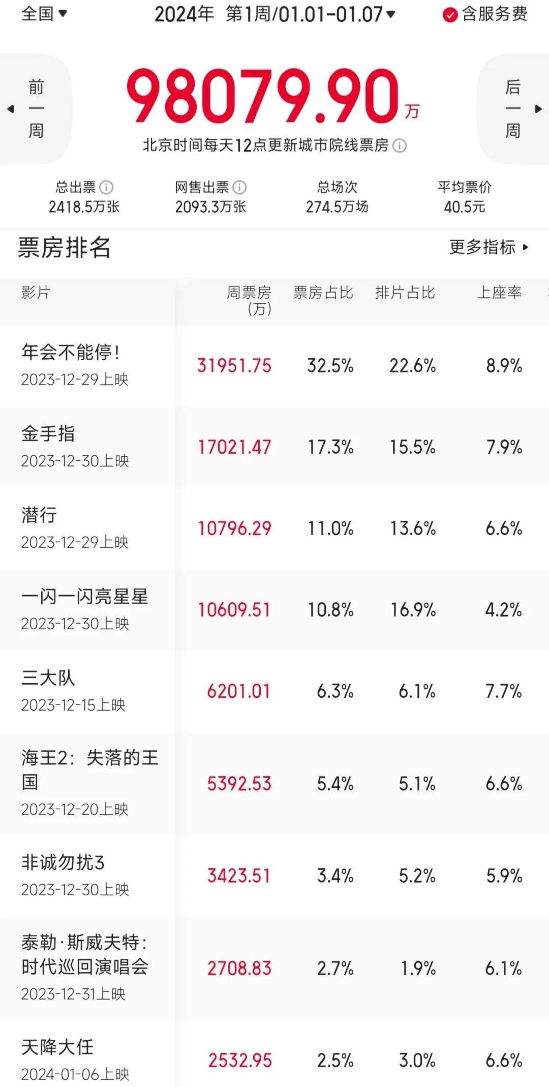 周榜前八名都不是上周上映的新片,而还是“六部元旦档电影 两部更早上映电影”的老组合。