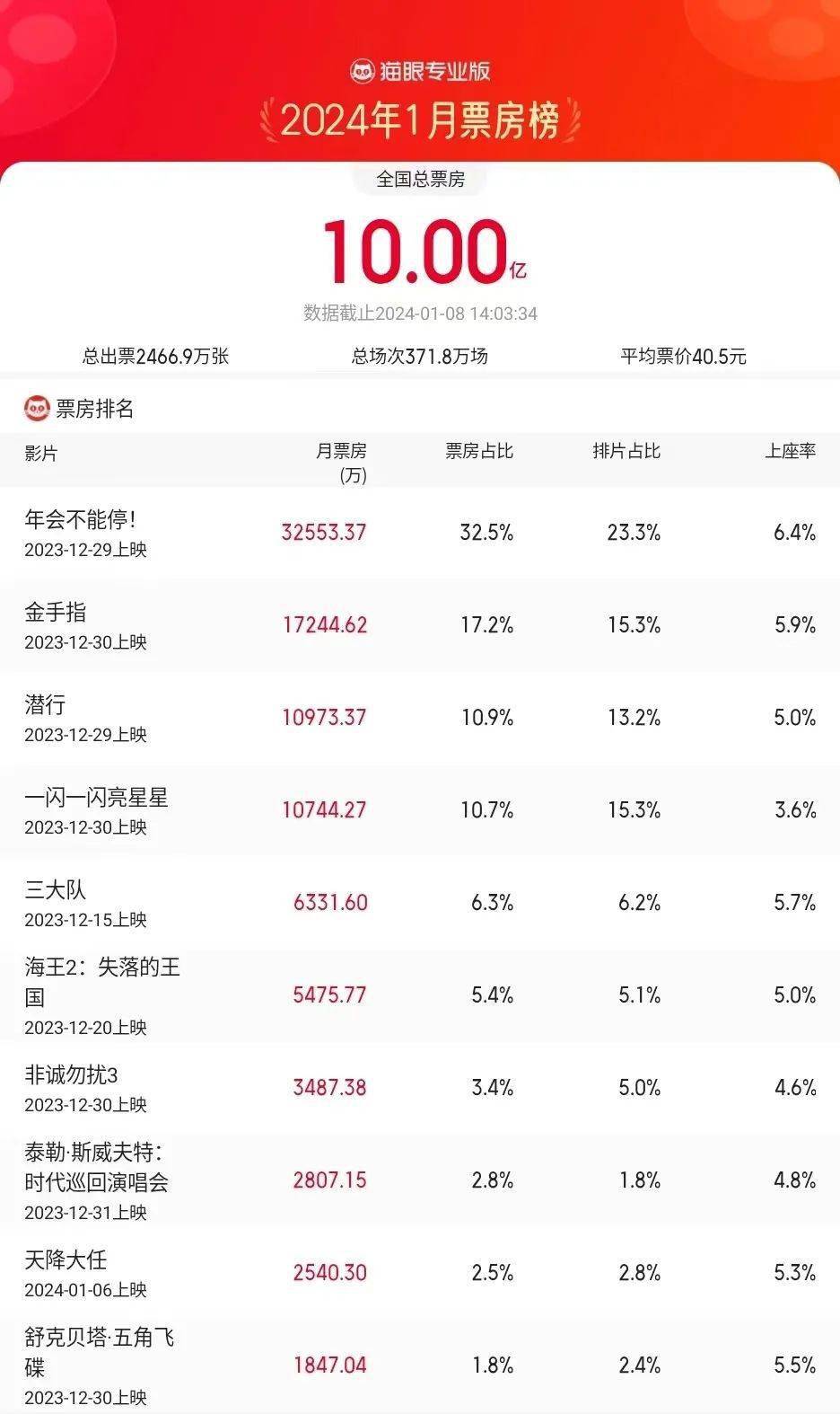 据猫眼专业版数据,1月8日14时03分,2024年1月总票房破10亿,《年会不能停!》《金手指》《潜行》分列1月票房榜前三位。