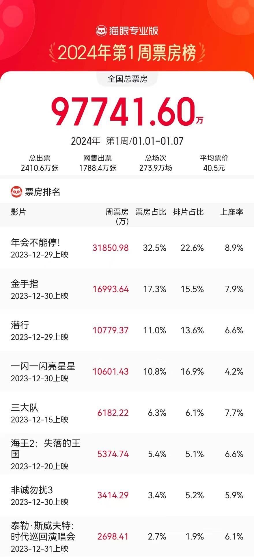 原标题:1.1-1.7内地一周票房9.77亿 《年会不能停!》次周3.18亿夺冠累计5.55亿