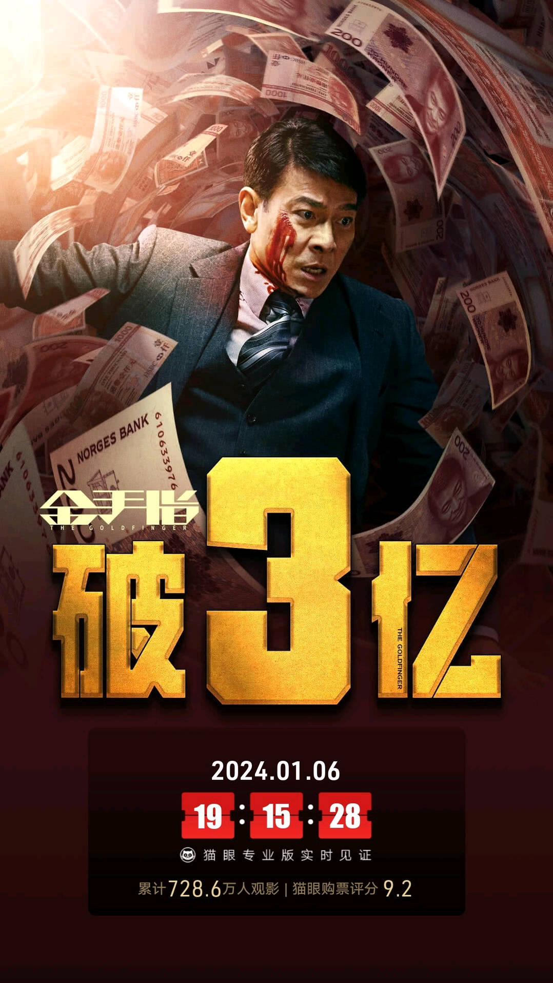 梁朝伟、刘德华主演电影《金手指》次周收1.69亿居亚,上映9天累计3.26亿。