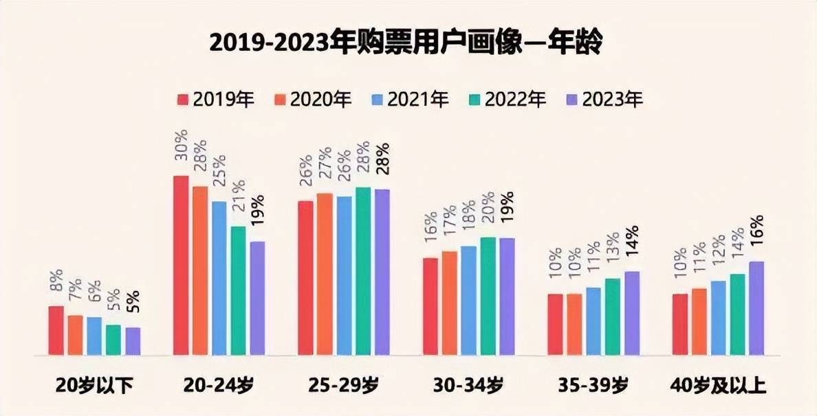 数据对比则更为直观。20岁以下群体,2019年占比为8%,2023年连续下降跌至5%。20-24岁这一群体,2019年占比为30%,2023年连续下降已经跌至19%。这代表着24岁以下这个最“年轻”的观影群体,正在流失。