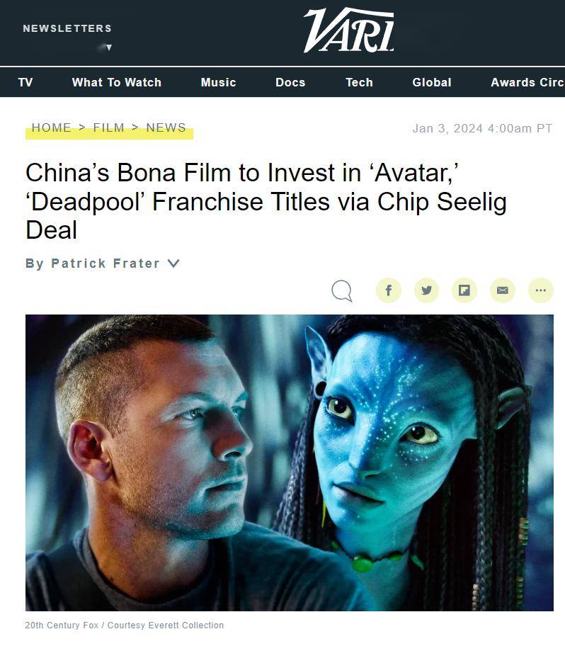 据外媒《综艺》报道,博纳影业去年12月31日和美国融资机构TSG Entertainment Finance达成协议,将投资一系列即将上映的电影,其中包括《阿凡达3》和《死侍3》《猩球崛起:新世界》《异形:罗慕路斯》等。